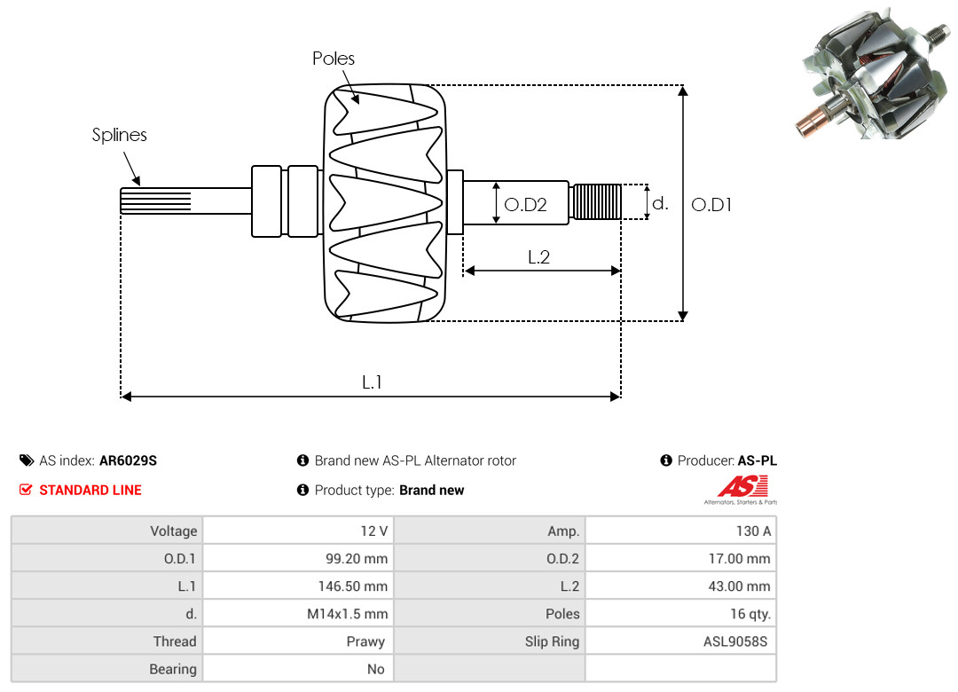 AS-PL Läufer, Generator Universal 12V 130A 99,20mm für TOYOTA HONDA 31101-RDJ-A01 27330-20130 31101-PGK-A01 AR6029S