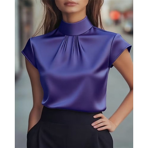 Per donna Camicia Elegant Raso/Satin Top estivi Semplice Elegante Vintage Signore Manica Corta Collo Alto Top Regolari Quotidiano Lavoro Ferie Arricciato Patchwork Drappeggiato Nero Bianco Viola