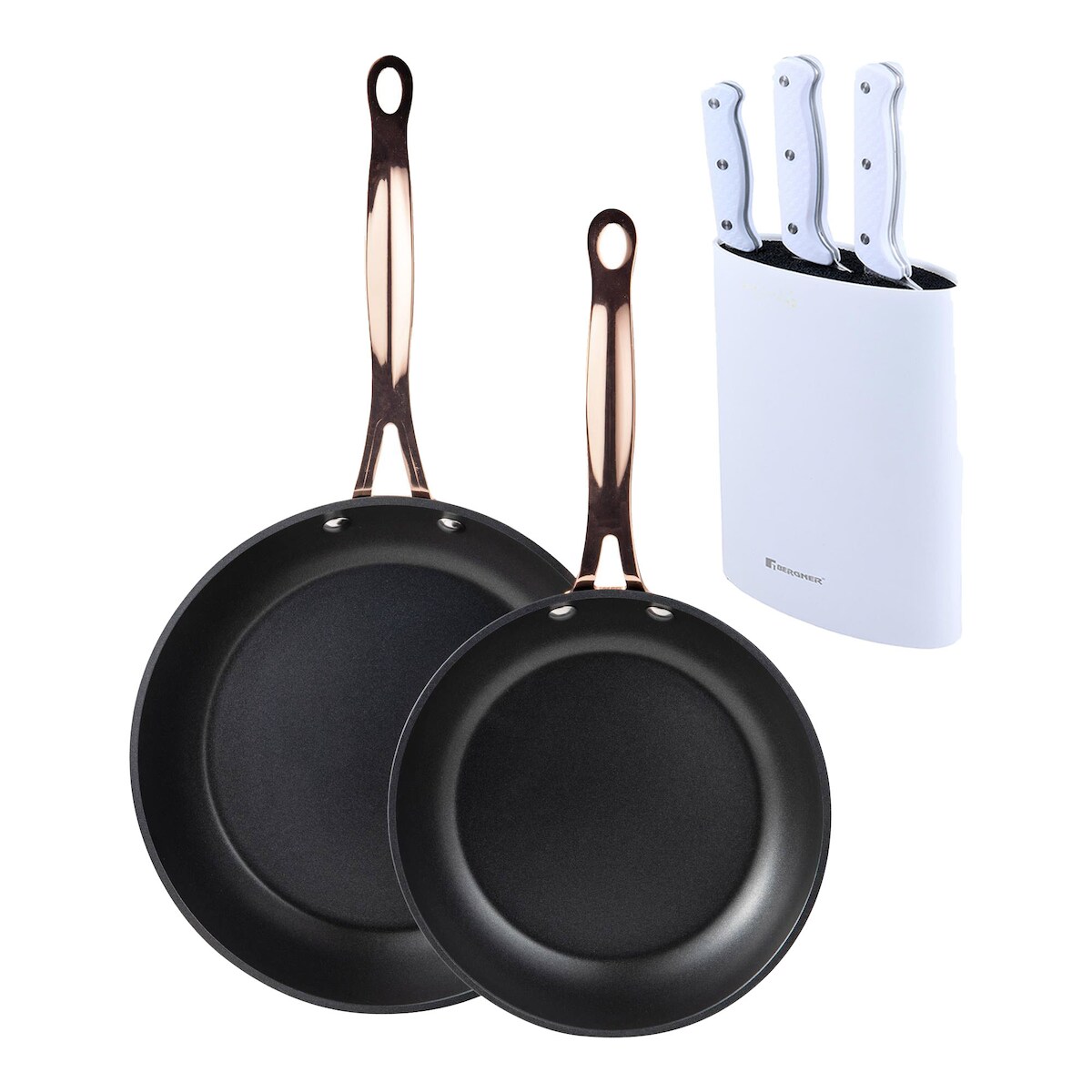 BERGNER - Set aus 2 Pfannen Ø20/24 cm aus geschmiedetem Aluminium Schwarz Matt mit Set aus 3 Küchenmessern Edelstahl