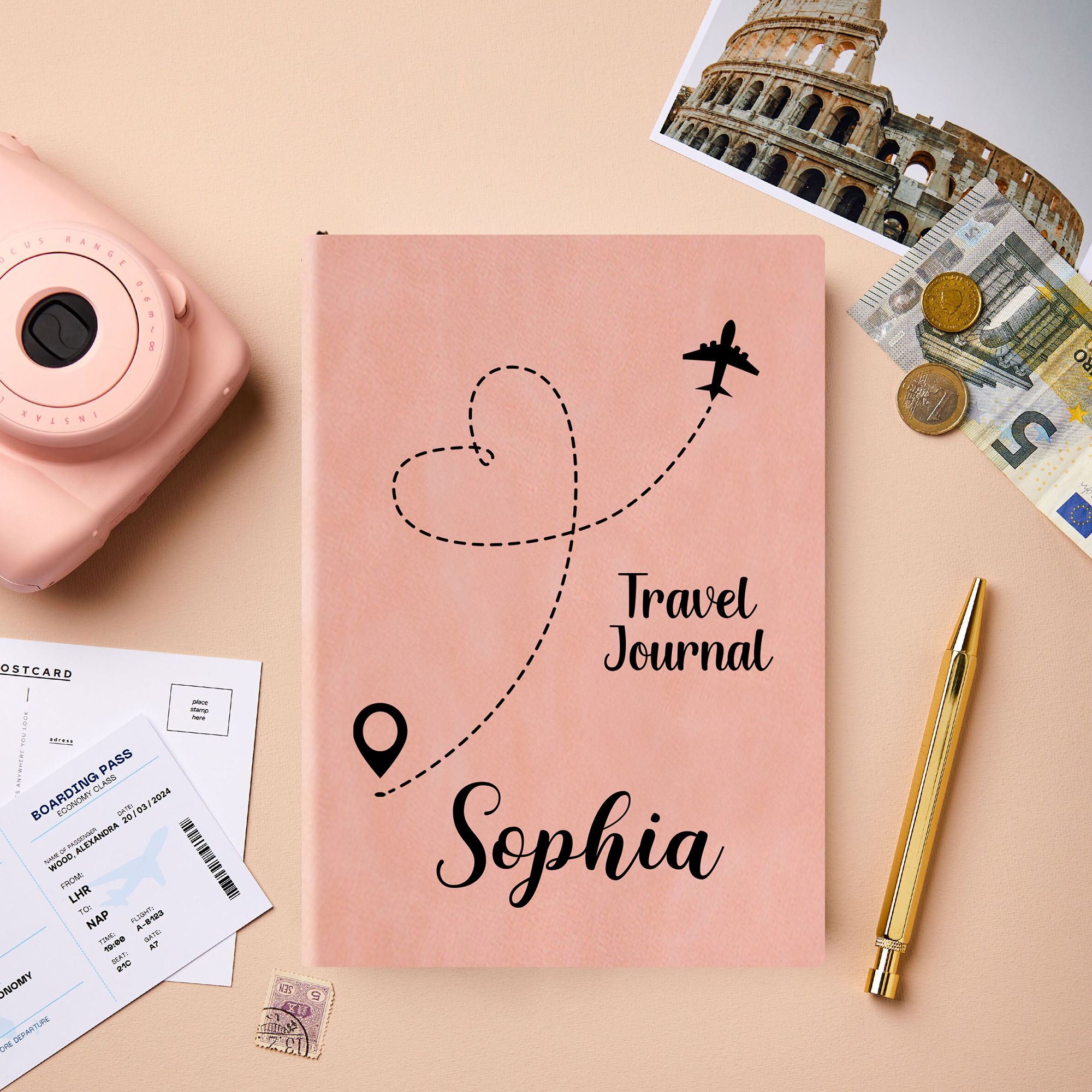 Taccuino personalizzato Heart Route Airplane Design A5 in pelle PU con nome e 100 pagine foderate Uso quotidiano Regalo di compleanno per gli amanti dei viaggi