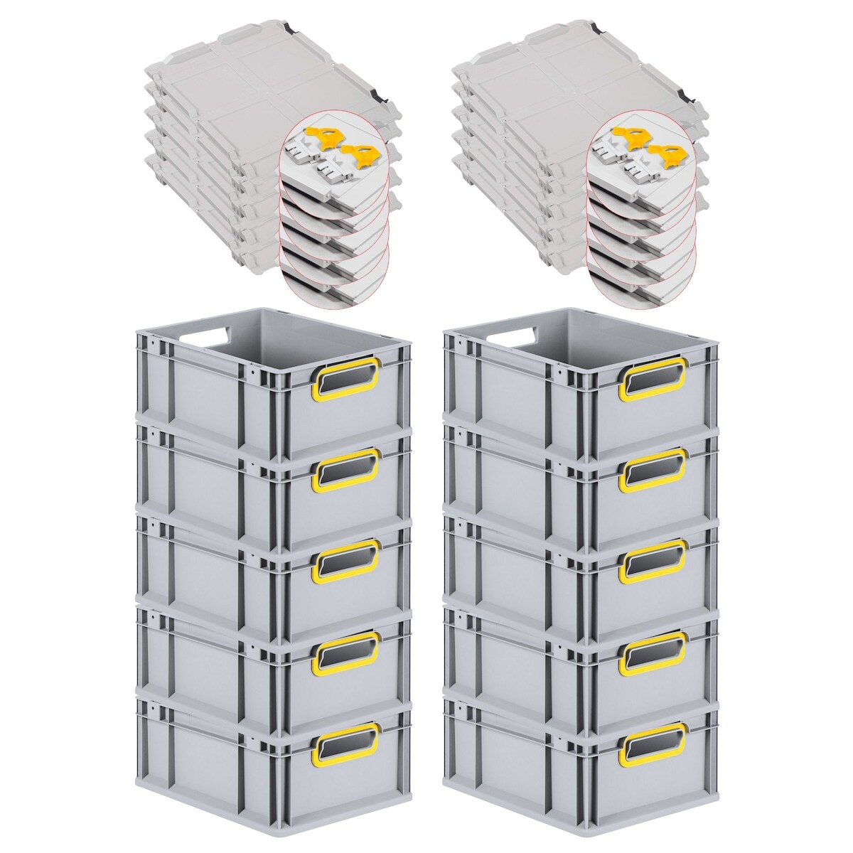 PROREGAL 10x Eurobox NextGen Color mit Scharnierdeckel & Verschlüssen | HxBxT 12x40x60cm | 23 Liter | Griffe gelb offen | Glatter Boden