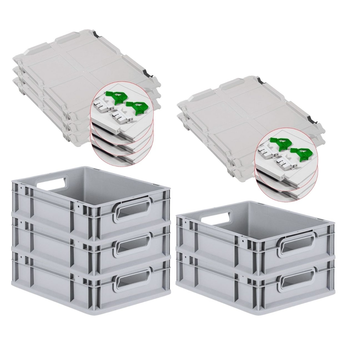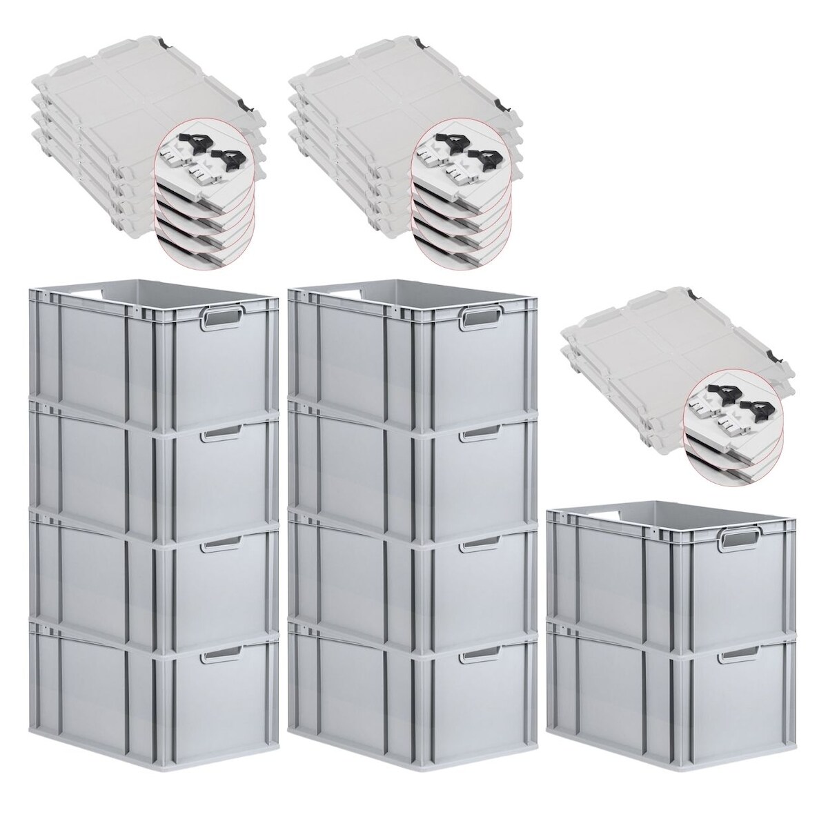 PROREGAL 10x Eurobox NextGen Grip mit Scharnierdeckel & schwarzen Verschlüssen | HxBxT 22x30x40cm | 20 Liter | Griffe offen | Glatter Boden