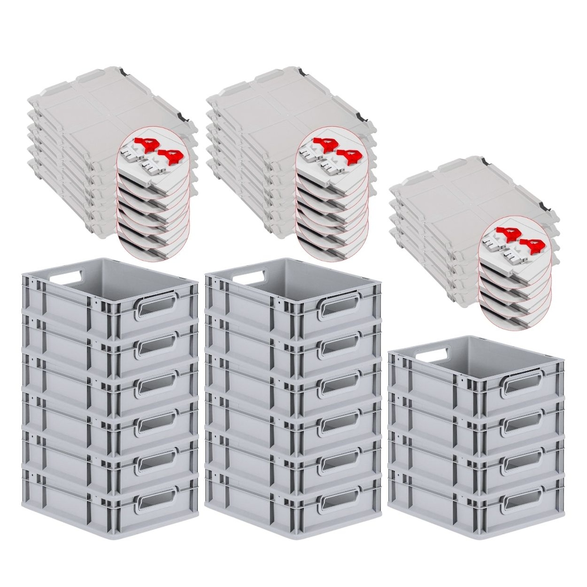 PROREGAL 5x Eurobox NextGen Grip mit Scharnierdeckel & roten Verschlüssen | HxBxT 32x30x40cm | 30 Liter | Griffe offen | Glatter Boden