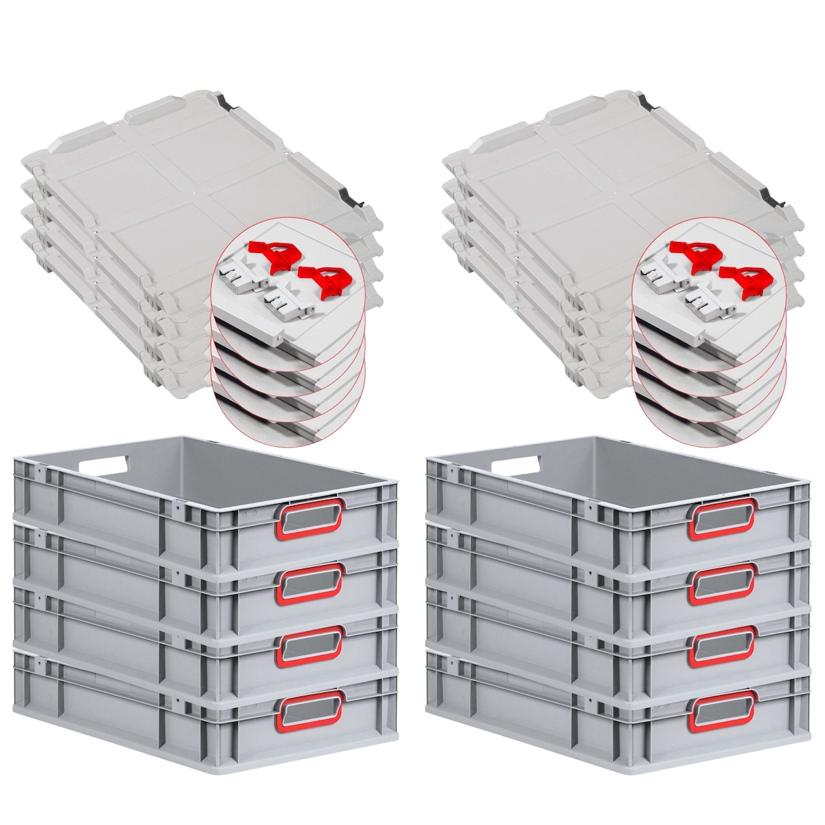 PROREGAL 4x Eurobox NextGen Color mit Scharnierdeckel & Verschlüssen | HxBxT 22x40x60cm | 44 Liter | Griffe rot offen | Verstärkter Boden