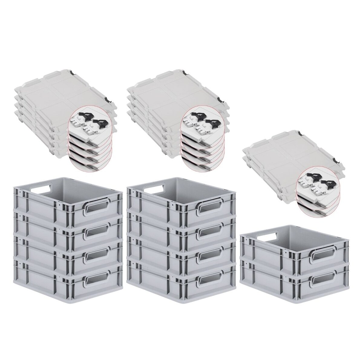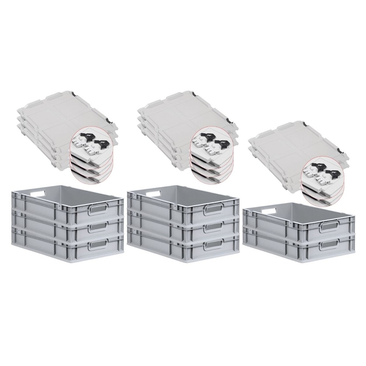 PROREGAL 10x Eurobox NextGen Grip mit Scharnierdeckel & schwarzen Verschlüssen | HxBxT 12x30x40cm | 11 Liter | Griffe offen | Glatter Boden