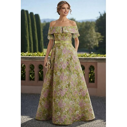 Linea ad A Lunghezza al pavimento Abito da Sera Elegante Manica Corta Senza Spalle Matrimonio Formale Tasca Jacquard con Tasca