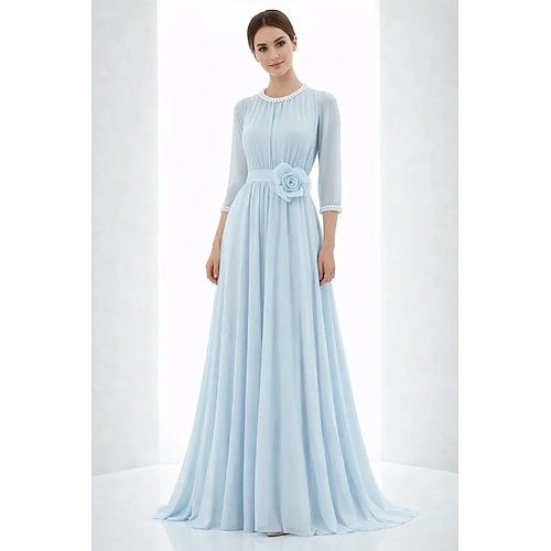 Linea ad A Lunghezza al pavimento Abito da Sera Elegante Brillanti Manica 3/4 Girocollo Matrimonio Formale Chiffon con Arricciato Perle
