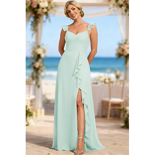 Linea ad A Vestito da damigella Spalline sottili Senza Maniche Elegante Lunghezza al pavimento Chiffon con Spacco sul davanti / Arricciatura