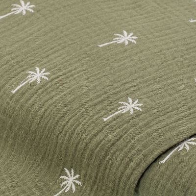 Tissu mousseline/double gaze "palmiers", brodé, olive/blanc