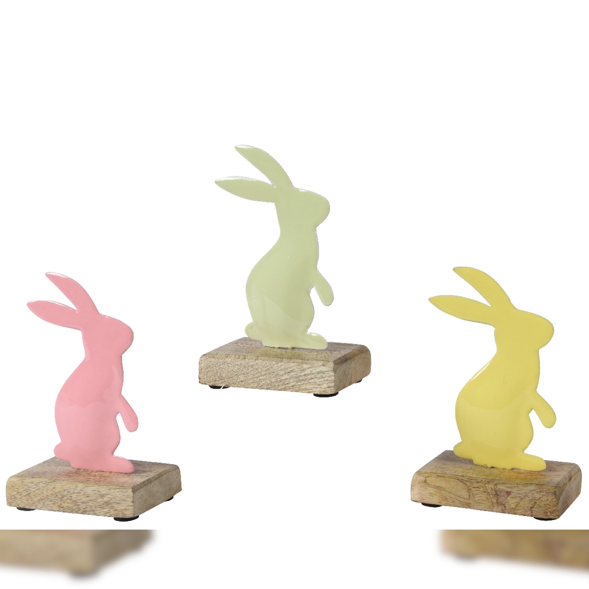 Decoris 1 Dekofigur Osterhase 12cm Metall Holz Dekohase Osterdeko Tischdeko Ostern Frühlingsdeko Osterschmuck Metalldeko Hase Figur Geschenk Gelb Grün Rosa