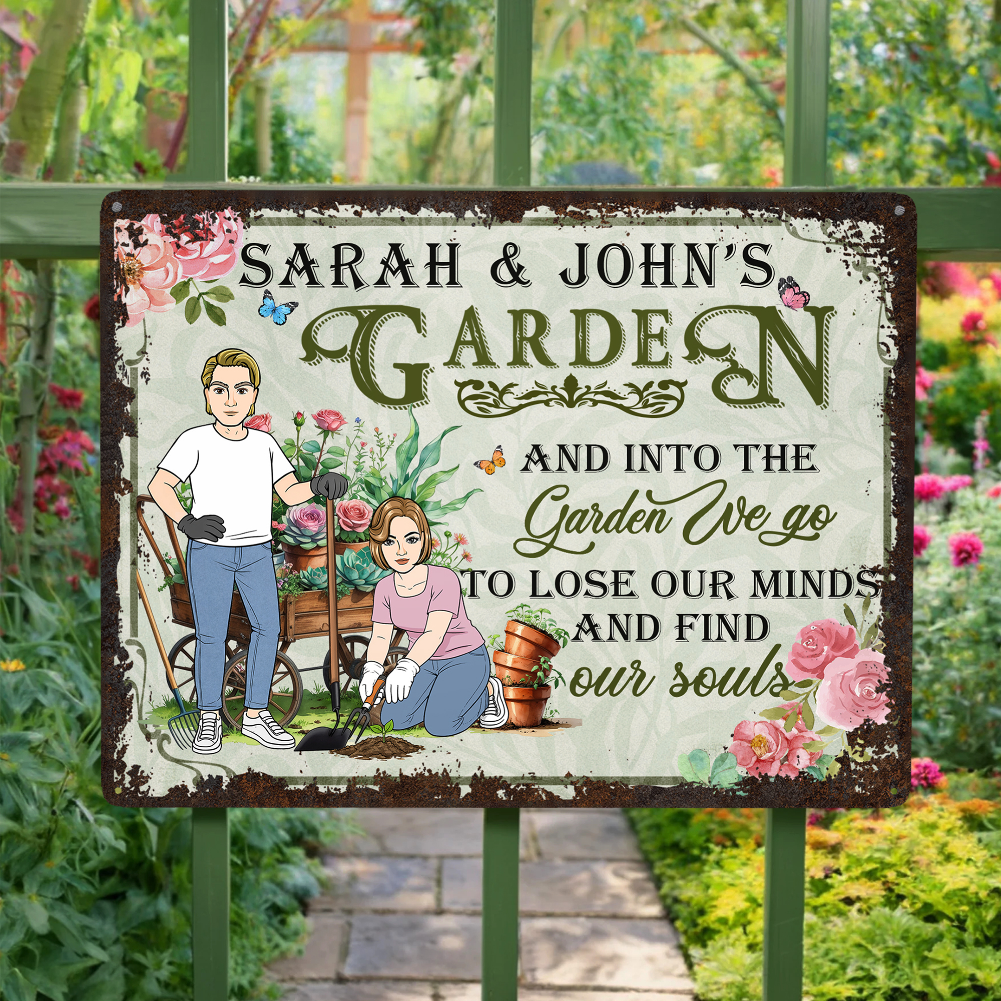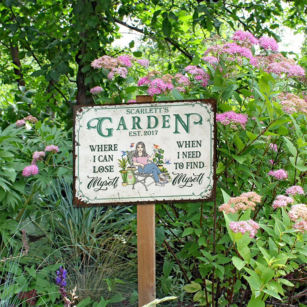 Panneau en métal personnalisé en forme de personnage de dessin animé avec nom et texte Décoration de jardin Cadeau d'anniversaire pour les amoureux du jardinage
