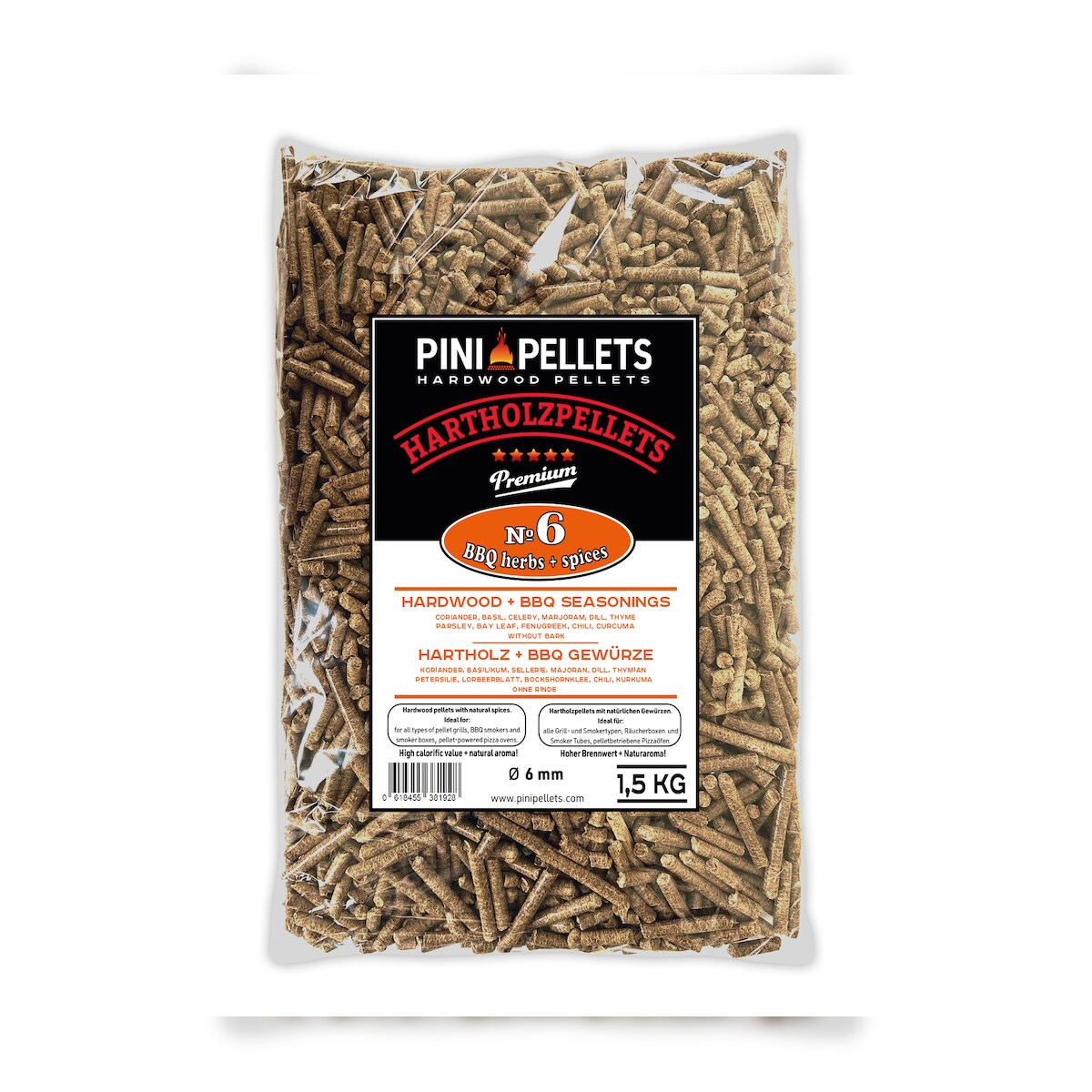 PINI Hartholz Pellets mit Gewürzen Nr. 6 BBQ Gewürze 1,5 Kg zum Grillen Räuchern Smoken