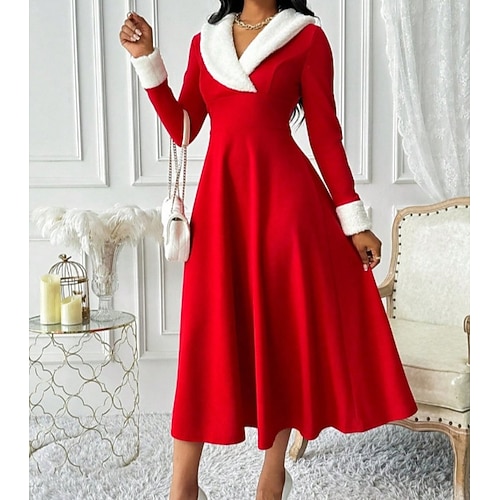 Natale Per donna Abito Midi Tubino Festa Feste Ferie Vestibilità regolare Semplice Manica Lunga Scollo a V Rosso Autunno Inverno