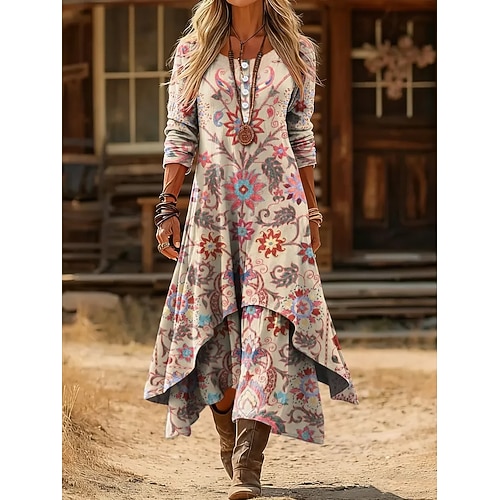 Per donna Abito Midi Tubino Abito a Tubino Casual Quotidiano Vestibilità regolare Floreale Grafico Paisley Manica Lunga Girocollo Blu Viola Marrone Verde Primavera Autunno Inverno