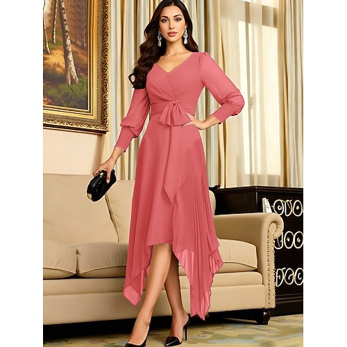 Linea ad A Asimmetrico Lunghezza alla caviglia Vestito da Festa Abito da Cocktail Abito da invitata a nozze Abito da cerimonia per signora Manica Lunga Scollo a V Elegante Vintage Formale Raso Velluto