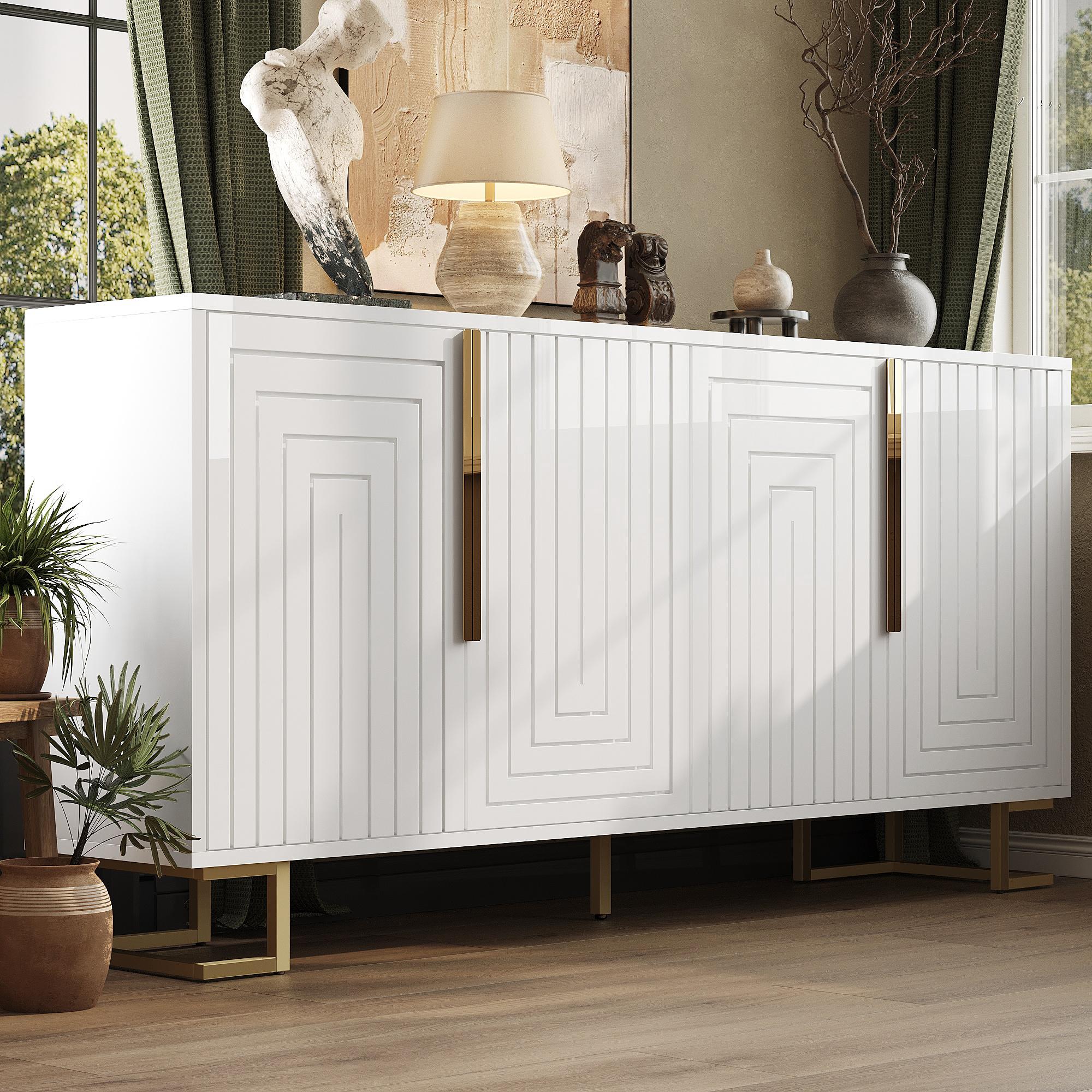 Stylish Sideboard with 2 Doors, 4 Shelves and Geometric Door Design, Durable Cabinet with Slim Metal Feet, 152L x 40W x 75H cm, White | Aosom UK
