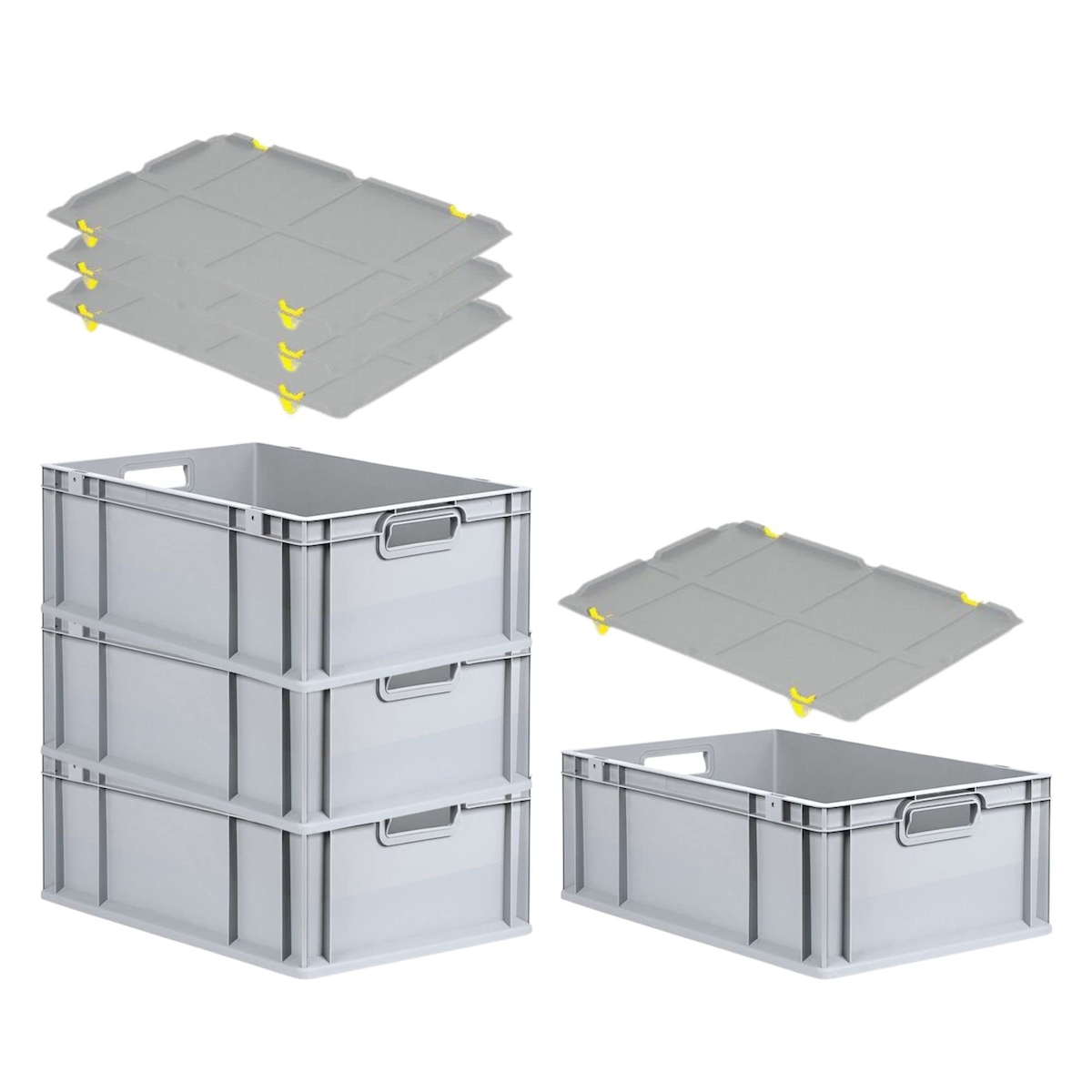 PROREGAL SuperSparSet 4x Eurobox NextGen Economy mit Auflagedeckel & 4x Verschlüsse Gelb, Griffe offen, HxBxT 22x40x60cm, 44L, Eurobehälter, Box
