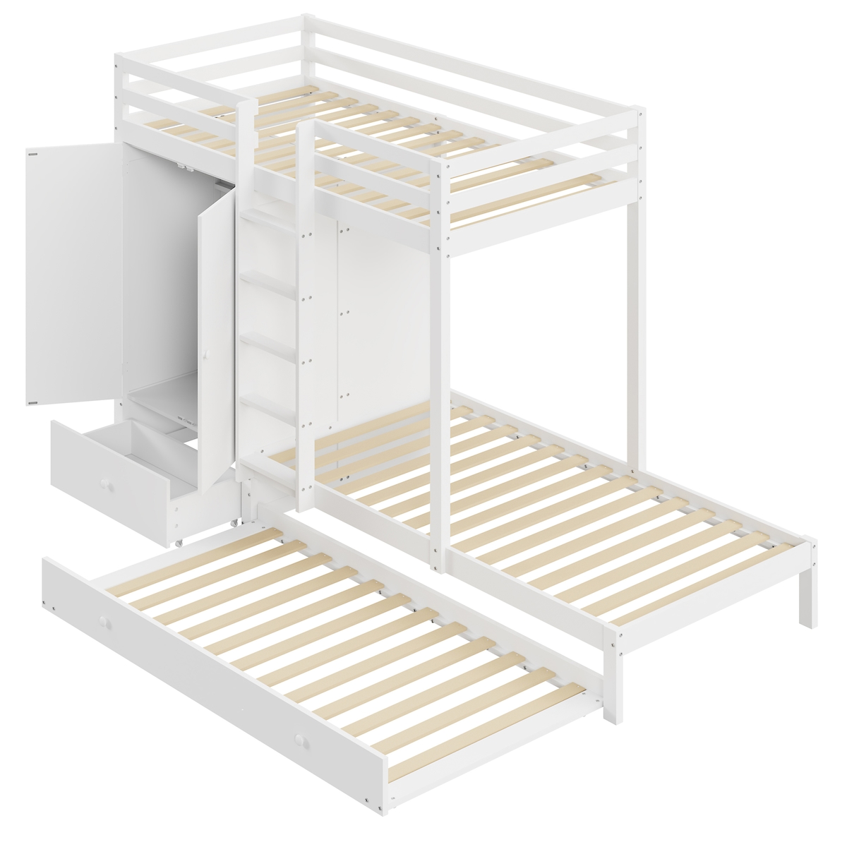 OKWISH Etagenbett Massivholz 90x200 cm mit Ausziehbett Kleiderschrank Schubladen Ablage Stauraum platzsparend robust elegant Weiß