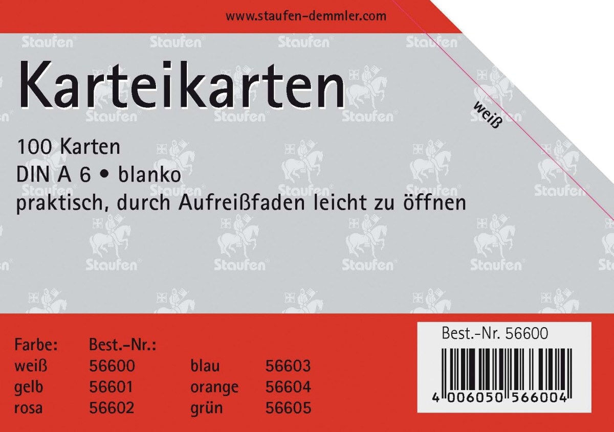 Staufen Karteikarten A6 blanko 180g/qm weiß VE=20x100 Stück