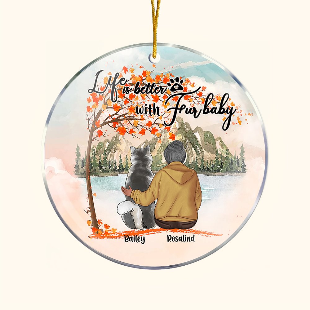 Adorno colgante acrílico redondo personalizado Life is Better with Fur Baby con fondo de hojas de arce rojas Regalo de cumpleaños navideño para amante