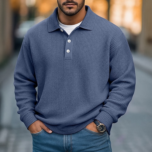 Per uomo Magliette Polo a Nido d'Ape Testurizzato Casuale Streetwear Colletto Polo a Coste Manica Lunga Moda Tinta unica Bottoni Puro Autunno Primavera Autunno Vestibilità comoda Viola Cachi Grigio