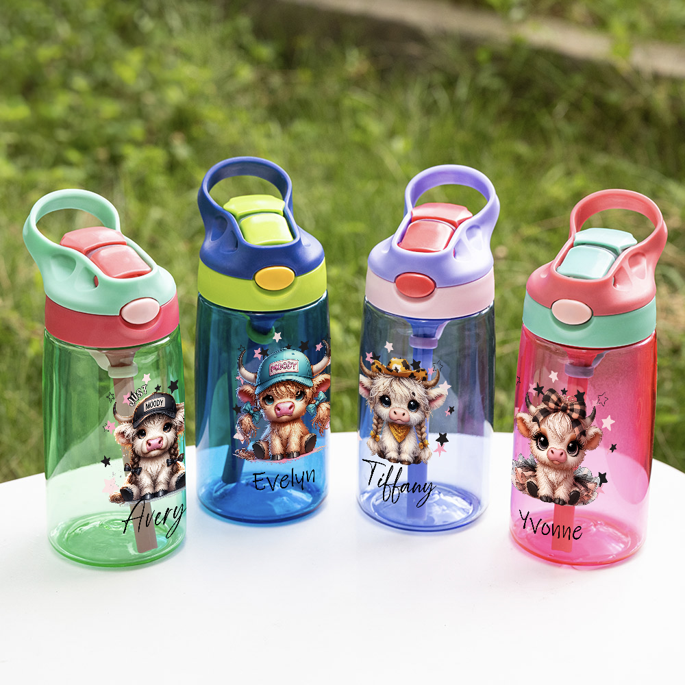 Gepersonaliseerde schattige strik hoed Highland koe 16 oz Kid waterfles met naam en handvat Silicone rietje terug naar school Verjaardagscadeau voor jongens meisjes