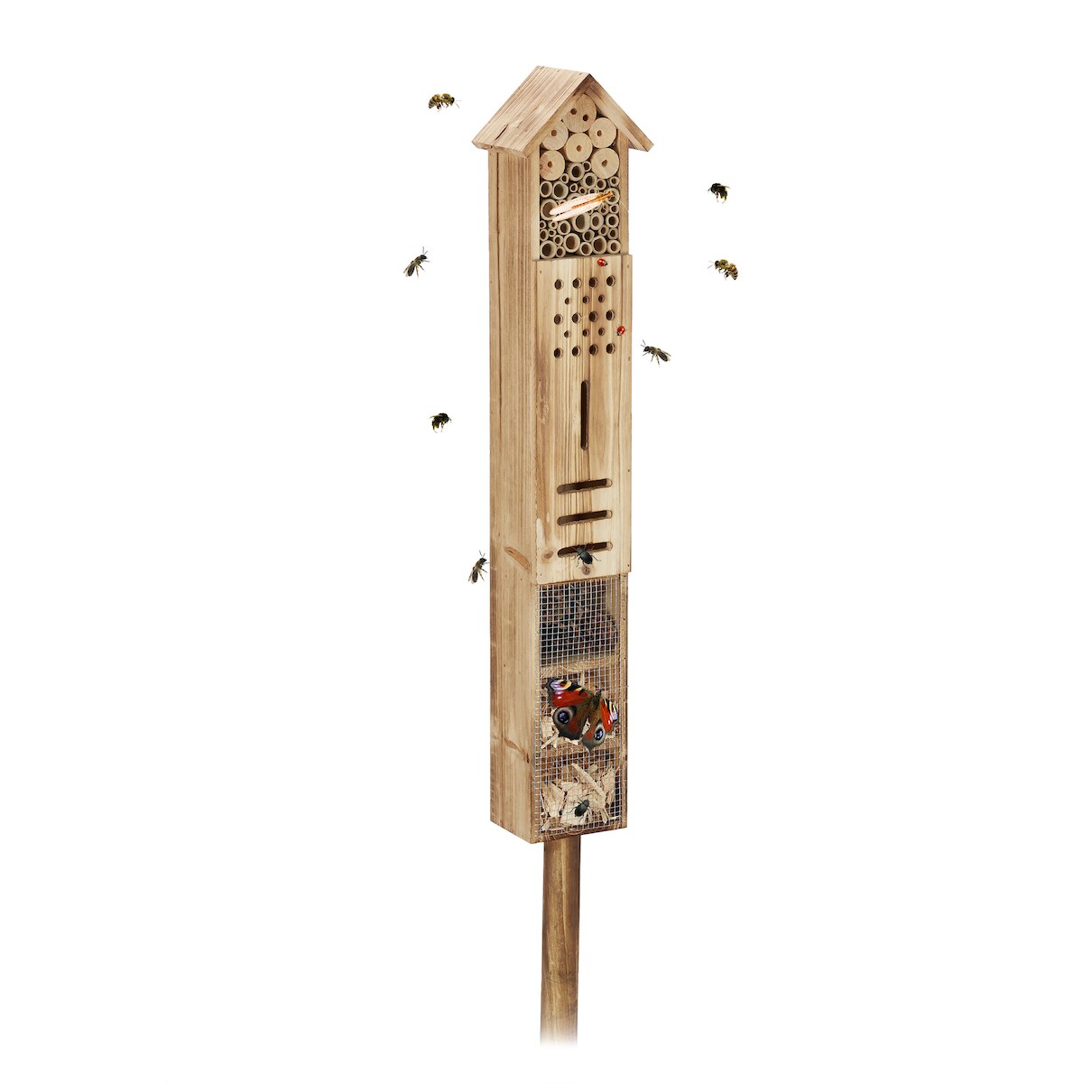 Relaxdays Insektenhotel mit Ständer, Holz, Insektenhaus Garten, HxBxT: 150 x 15,5 x 11 cm, Schmetterlingshotel, natur