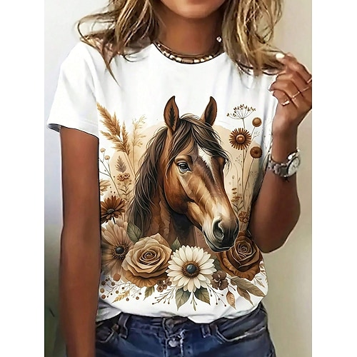 Per donna maglietta Pop art Cavallo Informale Manica corta Rotonda Top regolari Giornaliero Stampa Bianco Primavera Autunno