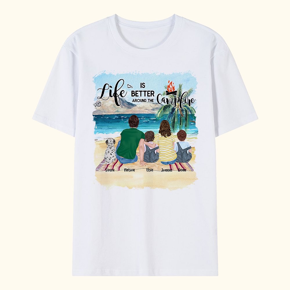 Camiseta personalizada Life Is Better Around The Campfire para adulto y niño Regalo de Navidad Regalo de cumpleaños Regalo de aniversario para la fami