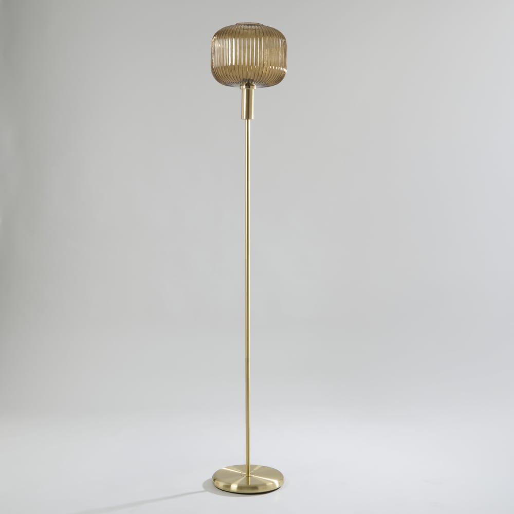 Lampadaire en acier doré et abat-jour en verre strié ambré H155