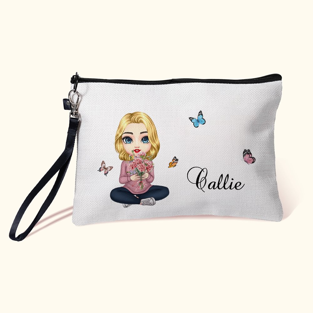 Personalized Birth Flower Bouquet Cartoon Character Linen Makeup Bag with Name and Wristlet Mother's Day Birthday Gift for Women Girls