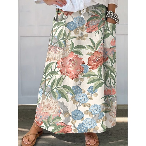 Per donna Gonna Casual Maxi Misura del girovita medio Gonne Floreale Floreale Inelastico Quotidiano Vacanza Marrone Blu scuro Bianco blu Beige Estate Poliestere