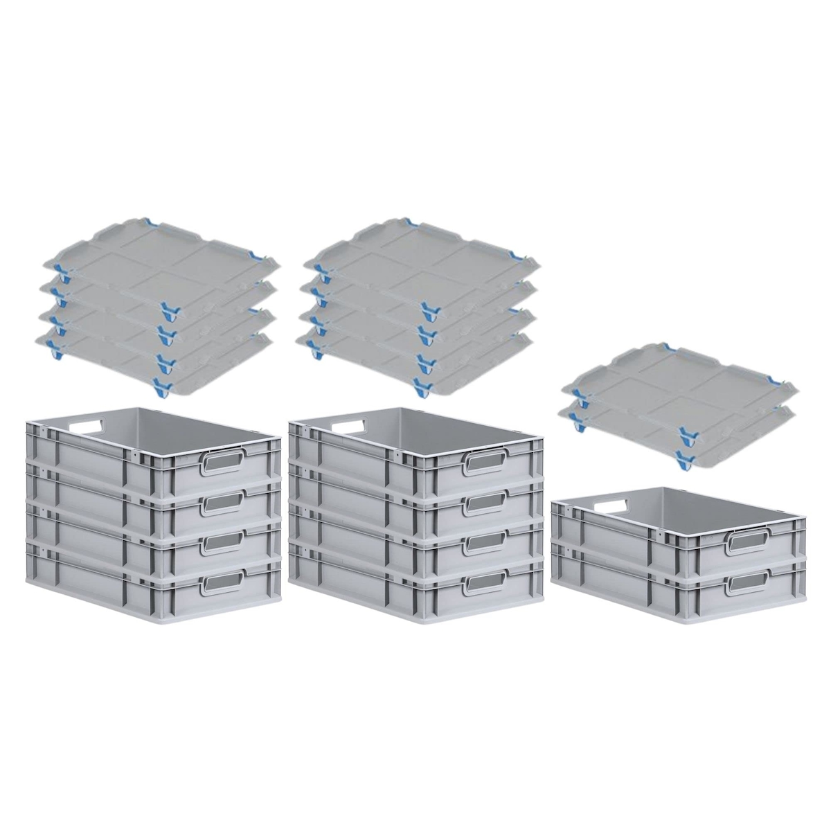 PROREGAL SparSet 10x Eurobox NextGen Economy mit Auflagedeckel & 4x Verschlüsse Blau, Griffe offen, HxBxT 12x40x60cm, 23L, Eurobehälter, Box