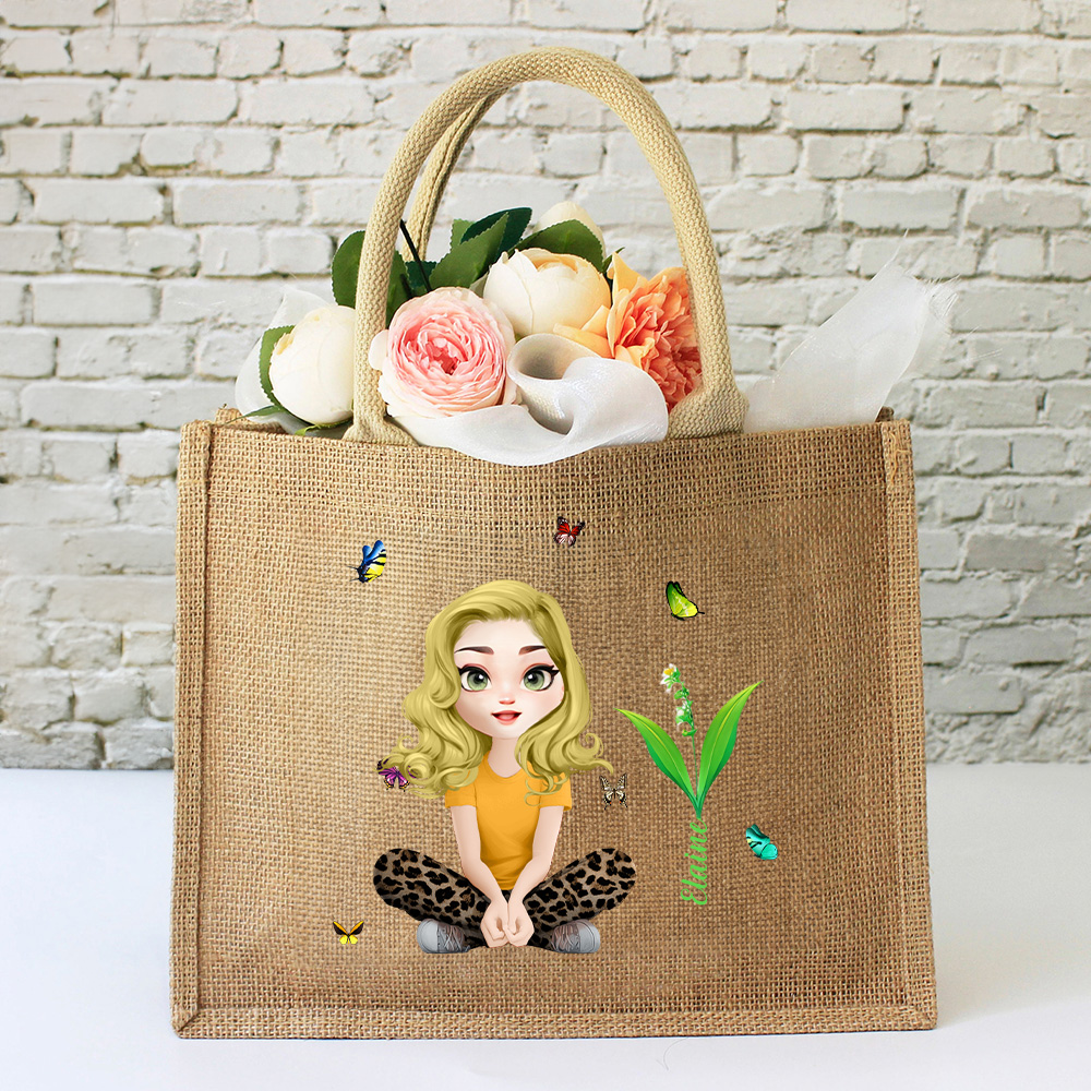 Personalizzato divertente 3D Cartoon Character Birth Flower Jute Tote Bag con nome Regalo di compleanno anniversario per donne ragazze