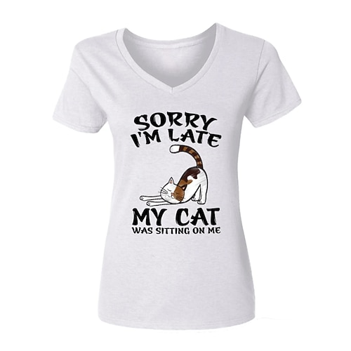 maglietta da donna casual gatto lettera stampa manica corta top regolari scollo a V quotidiano grigio chiaro estate sto bene