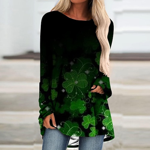 Giorno di San Patrizio Festa di San Patrizio Per donna Maglietta Foglia Giorno di San Patrizio Manica Lunga Girocollo Top Regolari Ferie Weekend Stampato Nero Bianco Verde chiaro Verde