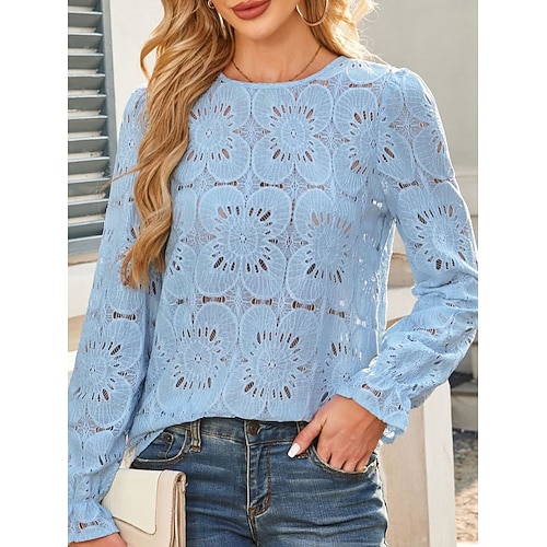Per donna Blusa Tinta unica Elegante Casual Manica Lunga Girocollo Top Regolari Quotidiano Pizzo Patchwork Blu Nero Bianco Rosa Primavera Autunno