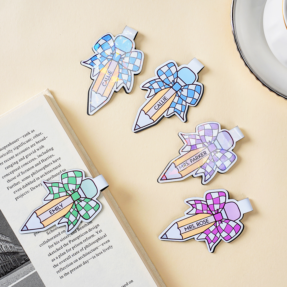 Personalizzato Plaid Bow Pencil Magnetic Bookmark Clip Set di 2 con il nome di lettura Forniture Back to School regalo di compleanno per gli insegnanti bambini
