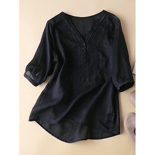 Per donna Blusa Tinta unica Elegante Casual Manica 3/4 Scollo a V Top Regolari Quotidiano Pizzo a contrasto Blu Nero Bianco Rosa Blu marino Estate