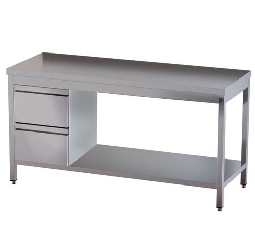 Edelstahl Arbeitstisch mit Grundboden, 2 Schubladen links, Premium - montiert: 200 x 60 cm / ohne Aufkantung / fertig montiert