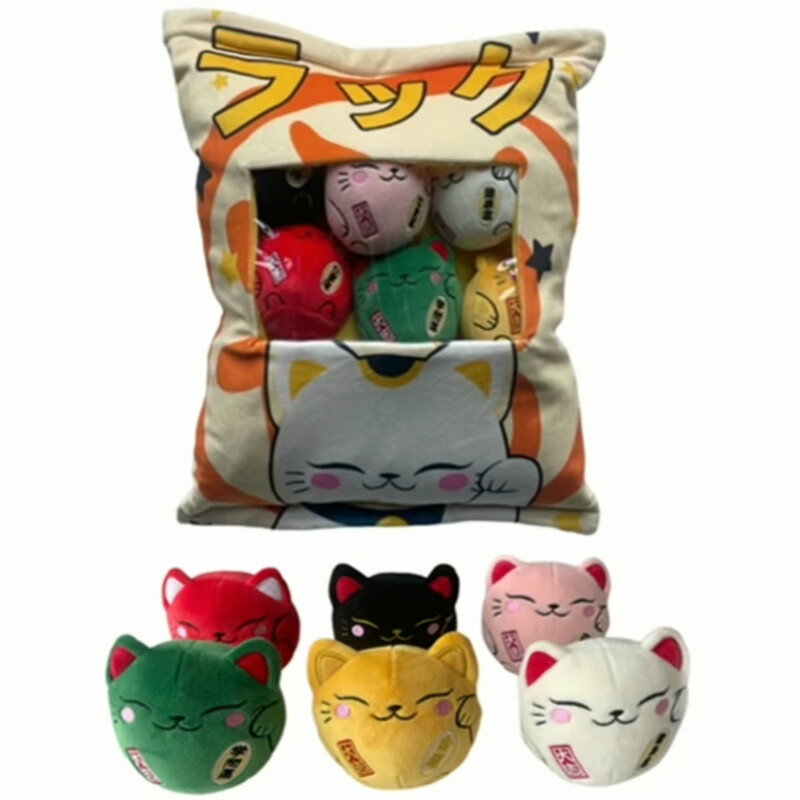 Coussin Kawaii + 6 mini Peluches Maneki Neko Chats Porte-Bonheur