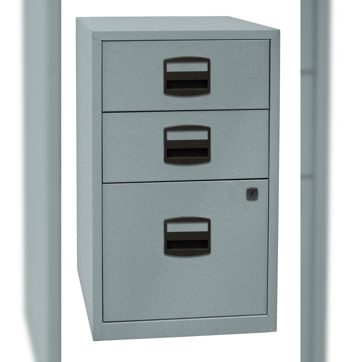Bisley Home Beistellschrank mit Schloss aus Stahlblech, 2 Universal-Schubladen + 1 Hängeregistratur-Schublade einbahnig abschließbar - für