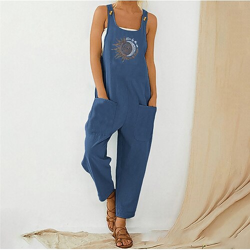 Tuta con stampa floreale da donna, stile streetwear, senza maniche, scollo a U, con tasche, per tutti i giorni, vestibilità regolare, outfit estivo nero, blu e grigio.