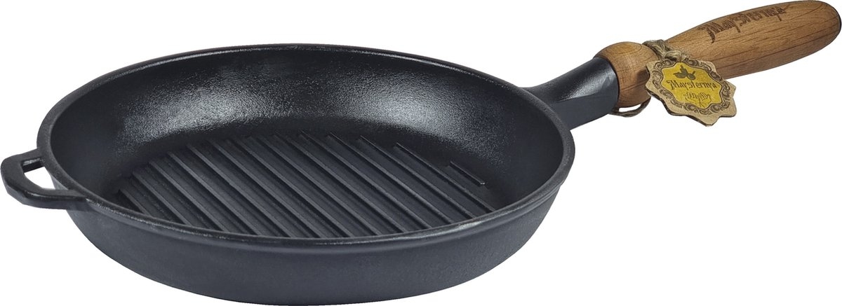 MAYSTERNYA Grillpfanne aus Gusseisen mit Holzgriff – ø 24 x 4 cm – Gusseisenpfanne für alle Wärmequellen – PFAS-frei – Schwarz