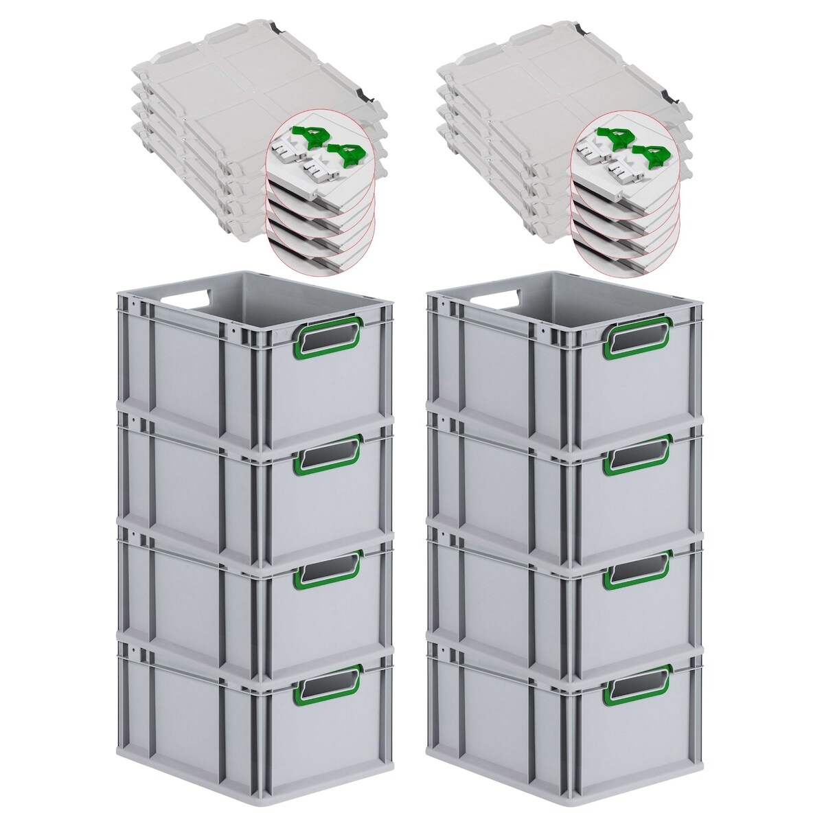 PROREGAL 8x Eurobox NextGen Color mit Scharnierdeckel & Verschlüssen | HxBxT 22x30x40cm | 20 Liter | Griffe grün offen | Glatter Boden