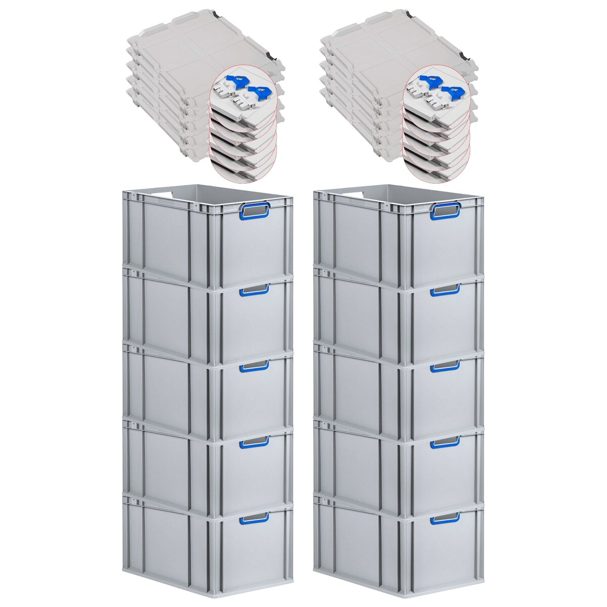 PROREGAL 10x Eurobox NextGen Grip mit Scharnierdeckel & blauen Verschlüssen | HxBxT 22x40x60cm | 44 Liter | Griffe offen | Verstärkter Boden