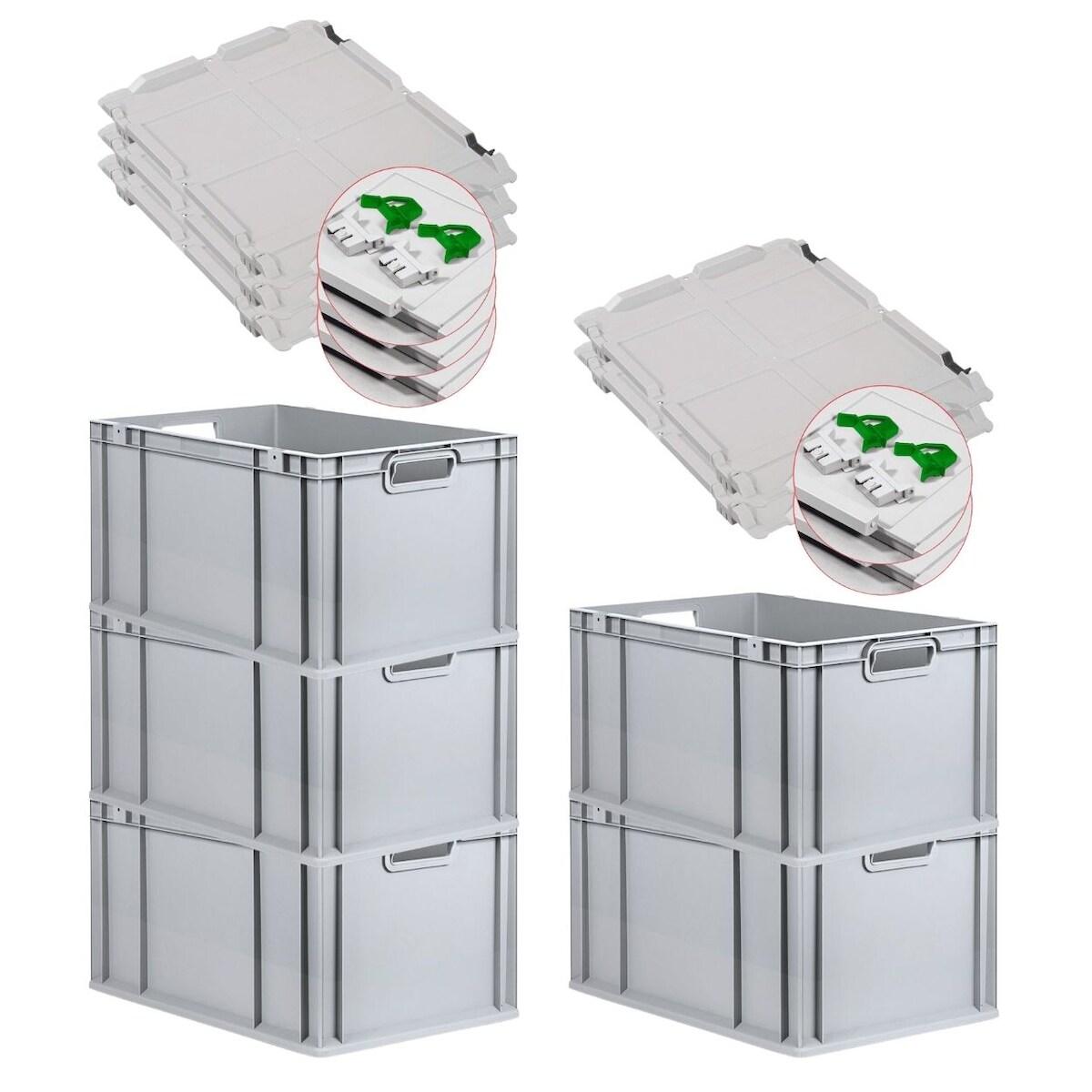 PROREGAL 5x Eurobox NextGen Grip mit Scharnierdeckel & grünen Verschlüssen | HxBxT 32x40x60cm | 65 Liter | Griffe offen | Verstärkter Boden