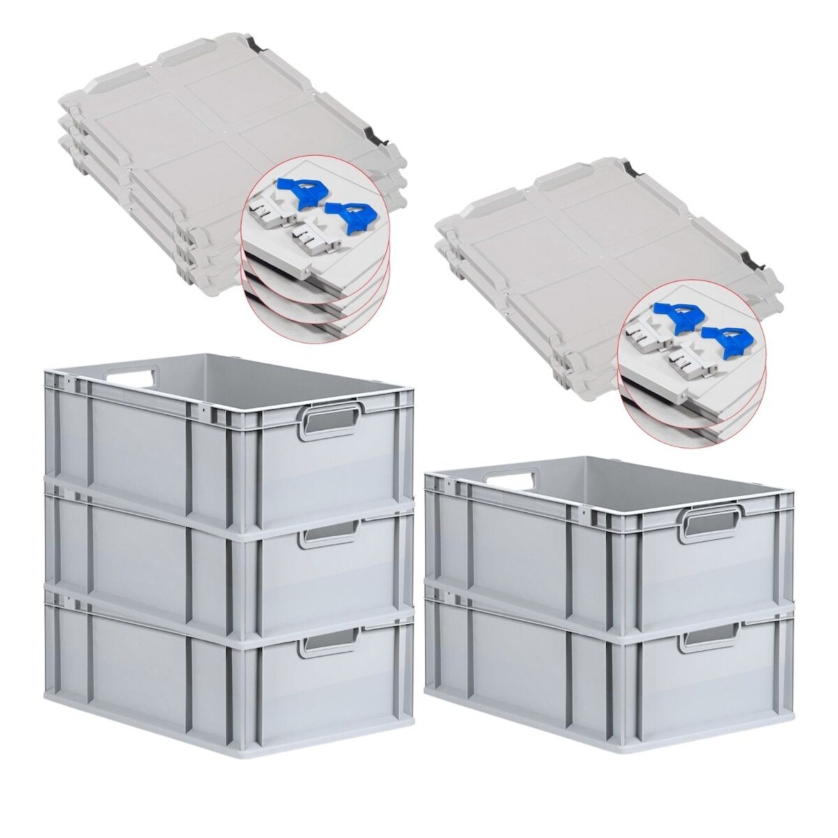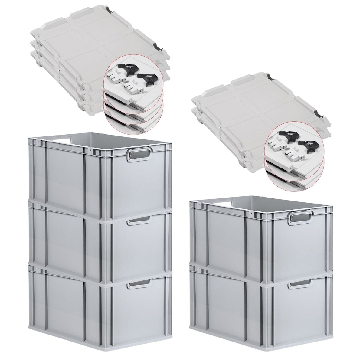PROREGAL 5x Eurobox NextGen Grip mit Scharnierdeckel & schwarzen Verschlüssen | HxBxT 32x40x60cm | 65 Liter | Griffe offen | Verstärkter Boden