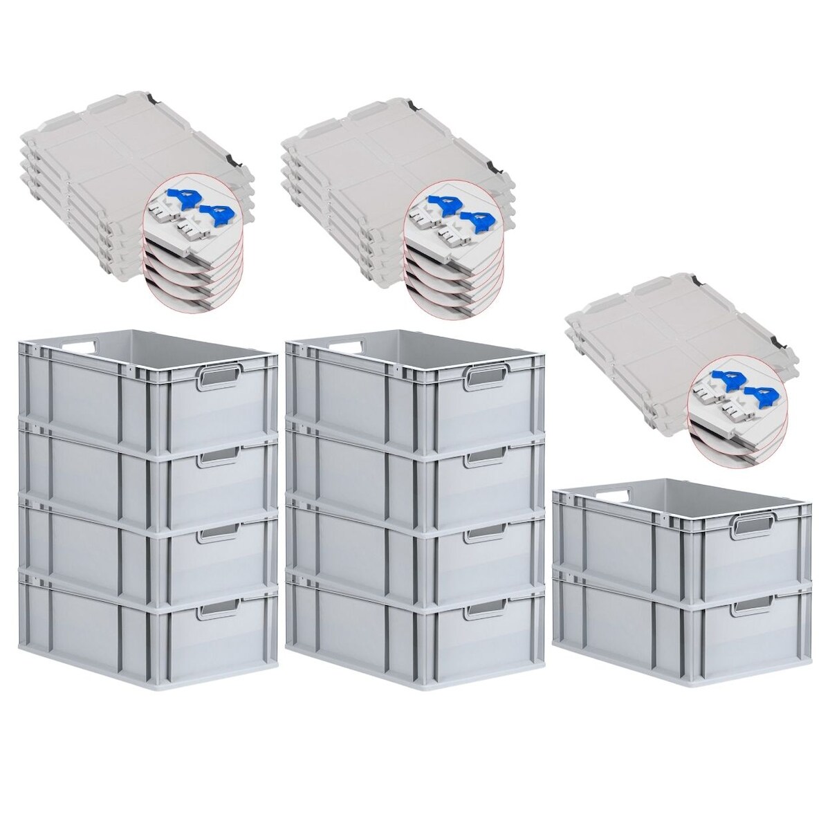 PROREGAL 10x Eurobox NextGen Grip mit Scharnierdeckel & schwarzen Verschlüssen | HxBxT 32x30x40cm | 30 Liter | Griffe offen | Glatter Boden