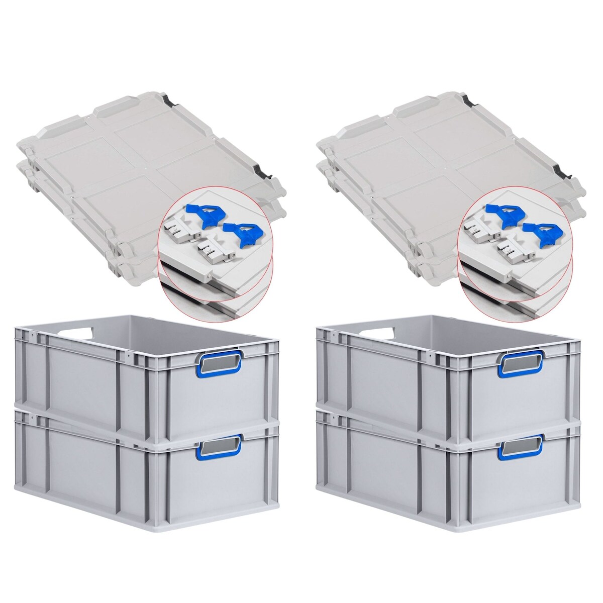 PROREGAL 4x Eurobox NextGen Grip mit Scharnierdeckel & gelben Verschlüssen | HxBxT 22x40x60cm | 44 Liter | Griffe offen | Verstärkter Boden